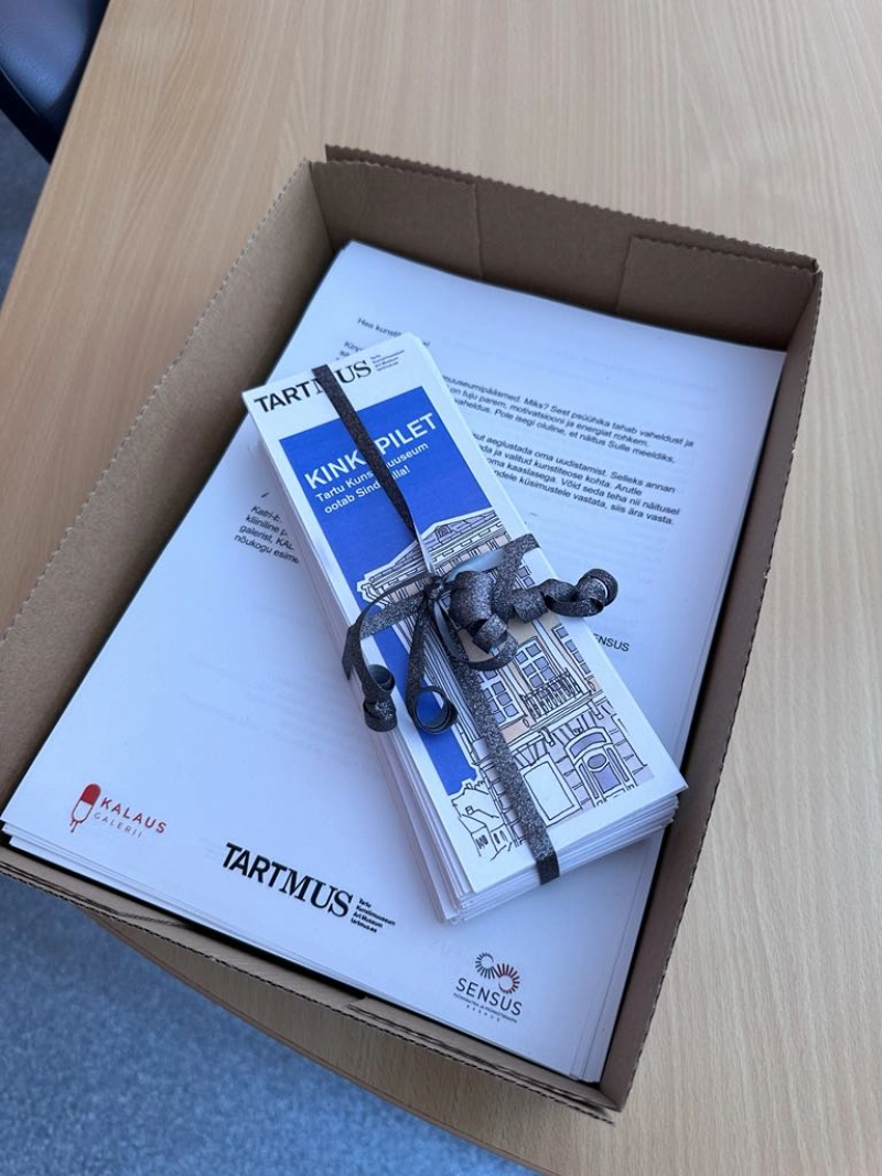 Kinkisime Tartu Ülikooli Kliinikumi Ambulatoorse osakonna patsientidele jagamiseks 280 TARTMUS-i piletit. Mujal maailmas kirjutavad psühhiaatrid ja kliinilised psühholoogid välja muuseumipääsmeid kui nn “sotsiaalseid retsepte“. Ikka selleks, et psüühikale oleks enam vaheldus ning meeleolu saaks parem. Kunst on kunstlik ravim! Tegime seda KALAUS galeriiga esmakordselt ka Eestis.